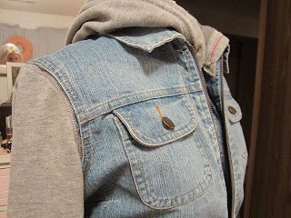 I see so many denim jackets in stores this fall with grey sweatshirt sleeves and a hood. I took a simple grey hooded sweatshirt and cut off the sleeves and hood. I sewed them to the denim jacket, carefully leaving the outside seams on the denim jacket as they were. I love the cool zipper in the front. This jacket can also be found at Second Impressions Thrift Store and is available for purchase right now. Remember, a portion of Second Impressions proceeds benefits the Grand Forks Humane Society. So not only do you get some cool, new threads to wear, you do something nice for your furry friends as well.